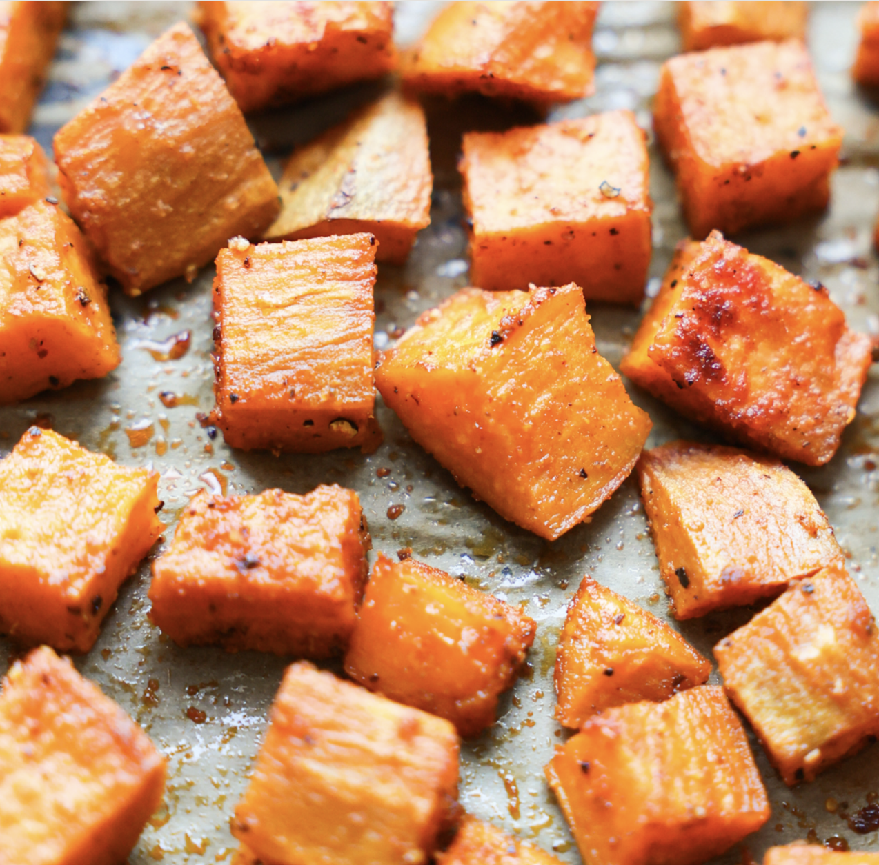 • Cube sweet potato, drizzle with fat of choice, season with salt and pepper.