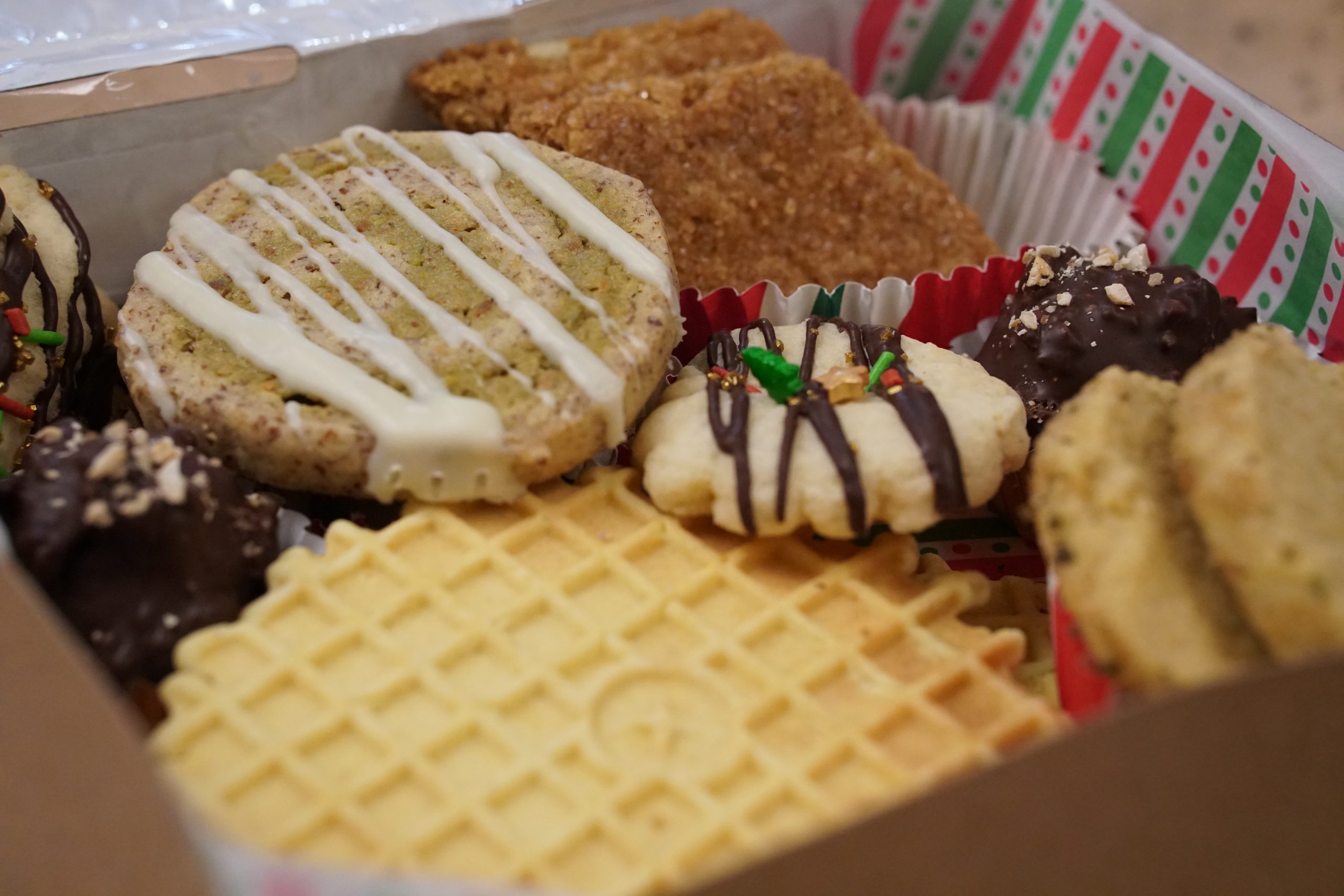 2 each of: Pizzelle, Triple Toasted Rye Shortbread, Hazelnut chocolate truffles, Brown Butter & Sage Sablés, Pistachio Pinwheels and spritz with chocolate drizzle.