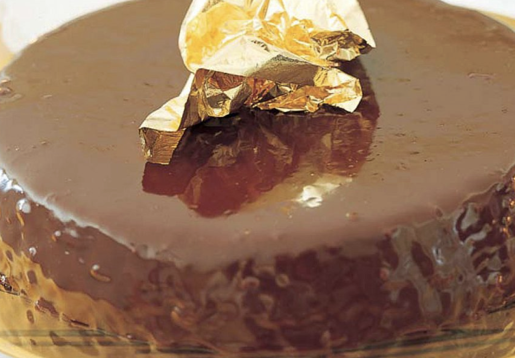 A rich, dense, flourless cake, enrobed in dark chocolate ganache, and decorated with goldleaf on top.