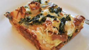 Even the most voracious bread consumers among us end up with a stale heel or two of bread from time to time, and a recipe like this turns a bag full of stale heels or slices, into a satisfying, healthy meal that no one would ever guess began with what many would toss in the bin. (lacking a bunch of stale bread, you can of course use a whole loaf) This recipe is bread plus veggies, cheese and an egg custard, baked until golden brown and served fresh from the oven or cooled to room temperature. It’s both simple to make and lends itself to advance preparation because a long soaked strata is way better than a hastily made one.